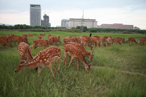 “包頭”在蒙語里意為“有鹿的地方”。自2000年起,內蒙古包頭市先后引進了100多頭經馴化的梅花鹿,放養(yǎng)在銀河廣場等公共場所供市民觀賞。同時,游客也可以在賽汗塔拉城中草原看到鹿群悠閑地吃草,形成人鹿和諧相處的獨特景觀。