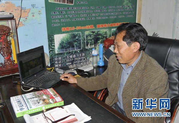 山東省濟寧市任城區李營街道續道苗圃負責人王緒道在網上查看信息。王緒道說,自己的苗圃年銷售額近千萬元,70%都是客戶在網上看到后主動聯系的,“搞寬帶工程真是太好了!” 新華網記者 韓元俊攝
