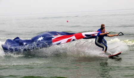 賽后澳大利亞滑水隊選手身披國旗在水面上飛馳