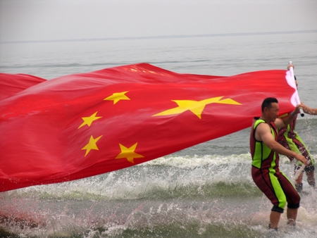 賽后中國隊(duì)運(yùn)動員手擎五星紅旗在水面上飛馳而過