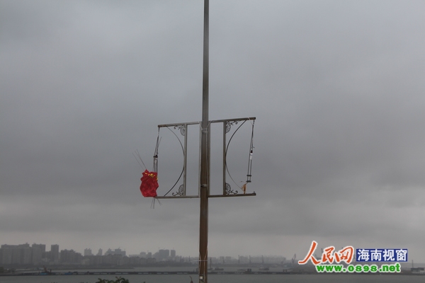 30日上午10時,記者在海口市世紀大橋上,看到大橋兩側路燈上為慶祝國慶節而布置的燈籠被風雨吹得七零八落,無法再支撐到10月1日。
