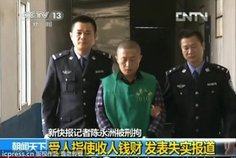 新華網(wǎng)北京10月26日電現(xiàn)經(jīng)公安機關(guān)查明,新快報記者陳永洲受人指使,于2012年9月至2013年8月間,在未經(jīng)核實的情況下,連續(xù)發(fā)表針對中聯(lián)重科的大量失實報道,多次收取他人提供的“酬勞”,致使中聯(lián)重科聲譽嚴重受損,導致廣大股民損失慘重。陳永洲的上述行為嚴重違反了《中國新聞工作者職業(yè)道德準則》,嚴重違背了新聞真實性原則,嚴重損害了新聞媒體公信力。新快報在長達一年的時間中連續(xù)發(fā)表多篇該記者署名的捏造事實的報道,嚴重失職,也應承擔相應的責任。