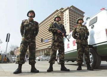 執勤武警在北京飯店附近執行任務。武警官兵坐在獵豹敞篷巡邏車內執行任務。一輛防彈運兵車上走下3名頭戴鋼盔、腳穿作戰靴的武警官兵,其中一名戰士手握95式突擊步槍。