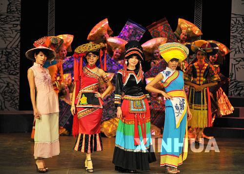 7月13日,演員在展示廣西民族服裝。