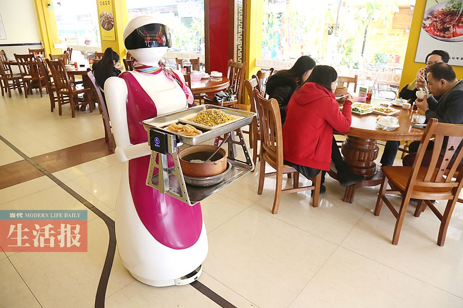 據(jù)覃女士介紹,這兩個“機器小妹”是今年1月份從外地“請”來的,通過電腦程序進行控制,每12個小時要充一次電。兩姐妹一到來,馬上成了顧客們關注的焦點。接下來,餐廳還計劃繼續(xù)引進機器點菜員和機器廚師。