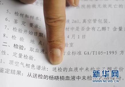 白山市公安局司法鑒定中心出具的酒精檢測報告顯示肇事人楊曉楠血液中沒有酒精成分(4月8日攝)。 新華社記者 林宏 攝