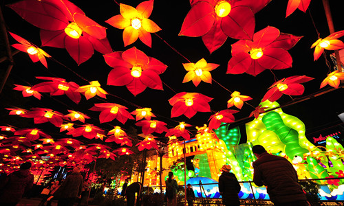 2月10日,市民在張家界市城區觀賞花燈。元宵節前夕,張家界市的各種俏麗花燈流光溢彩,吸引了眾多市民和游客前來觀賞。