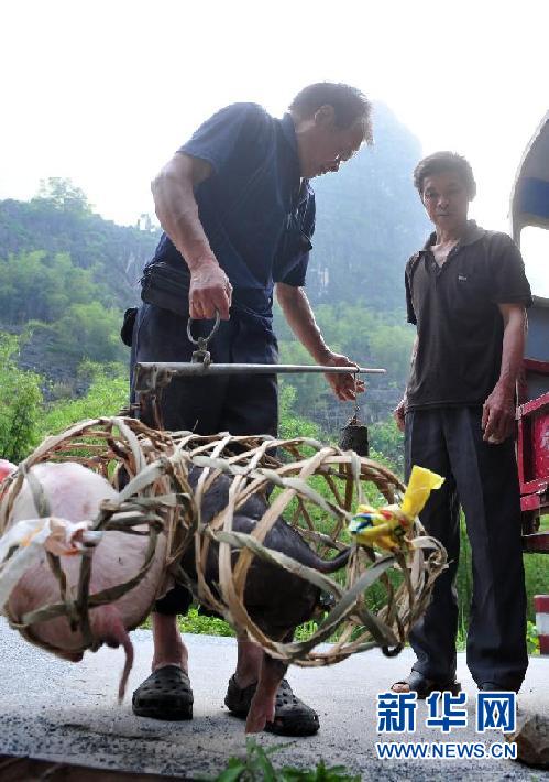 5月3日,在廣西馬山縣白山鎮新民村,農民在購買豬仔。新華社記者黃孝邦 攝