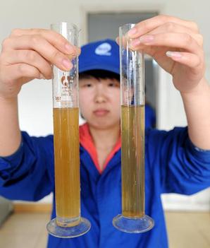 6月8日,哈藥集團制藥總廠污水處理車間化驗人員正在對藥廠排放的不同污水水樣進行對比。新華社記者 王松 攝