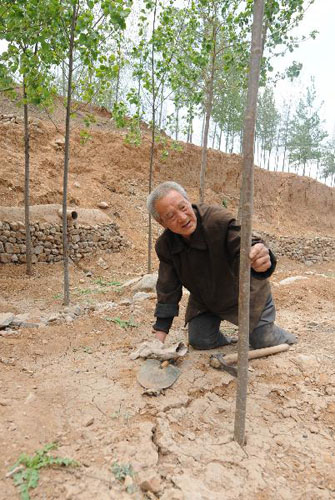 4月26日,馬三小在查看樹苗的生長情況。在貧瘠的太行山深處,一位失去雙腳的退伍老兵連續(xù)10年種樹3000余株,將荒山裝扮得郁郁蔥蔥……近日,新浪網(wǎng)民“石門拍客”拍攝的《無腿老偵察兵10年荒山栽樹3000多棵感動省城市民》視頻被多家網(wǎng)站轉載,引發(fā)網(wǎng)民極大關注。馬三小,這位來自河北省井陘縣的62歲退伍傷殘老兵,憑著軍人特有的堅強毅力,在山溝里數(shù)十年如一日“爬行”植樹增綠,演繹著震撼卻又真實的“士兵突擊”。新華社記者鞏志宏攝