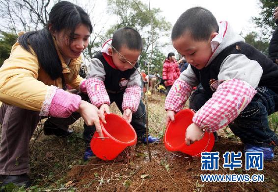資料圖片:3月10日,廣西桂林的一位媽媽帶著雙胞胎兒子參加植樹活動。 新華社發(李凱 攝)