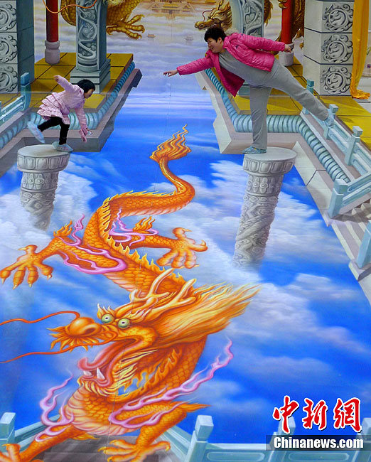 3月19日,“神龍?zhí)鞂m3D畫作品展”在北京王府井金街展出。該畫地面長度12米,高4.5米,寬6.3米,據(jù)悉,該畫展形式是與觀眾互動,觀眾可以站在畫面上,免費拍攝留影,畫展將持續(xù)一周。中新社發(fā)李文明 攝 圖片來源:中國新聞網(wǎng)