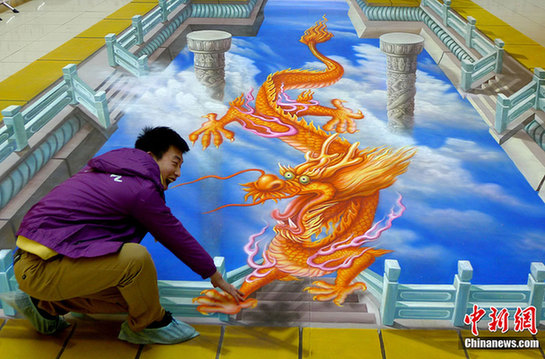 3月19日,“神龍天宮3D畫作品展”在北京王府井金街展出。該畫地面長度12米,高4.5米,寬6.3米,據悉,該畫展形式是與觀眾互動,觀眾可以站在畫面上,免費拍攝留影,畫展將持續一周。中新社發李文明 攝 圖片來源:中國新聞網