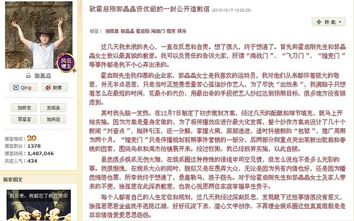 霍啟剛先生是我仰慕的企業(yè)家、郭晶晶女士是我喜歡的運動員,我對他們從來都懷著極大的敬意,并無半點惡意,只是當(dāng)時正煞費思量苦心孤詣炒作藝人,為了盡快“出效果”,我滿腦子只想著怎么在最短的時間、花最小的代價、用最出奇的手段把藝人炒紅達到預(yù)期目標(biāo),很多地方?jīng)]有顧慮到。