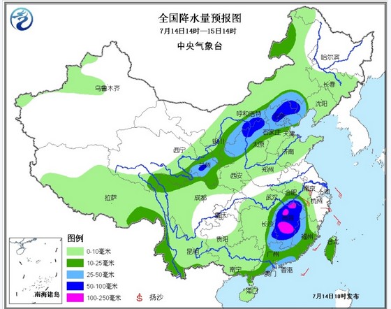 臺風(fēng)減弱,暴雨持續(xù)。中央氣象臺14日10時繼續(xù)發(fā)布暴雨藍色預(yù)警,預(yù)計14日14時至15日14時,受“蘇力”殘余環(huán)流和西南季風(fēng)的共同影響,福建西部、江西大部、湖南東部、廣東北部和沿海地區(qū)、安徽南部、湖北東南部等地有大雨或暴雨,其中,江西北部局地和中南部、安徽西南部局地有大暴雨(100~150毫米);甘肅南部、陜西北部、華北北部等地的部分地區(qū)有大雨,局地暴雨(50~90毫米),并伴有短時雷雨大風(fēng)或冰雹等強對流天氣。