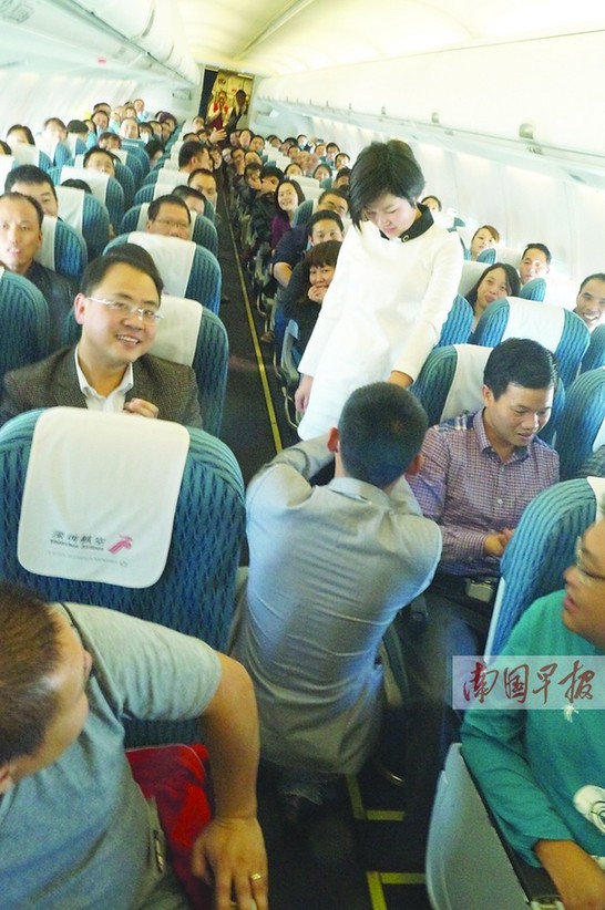 機(jī)艙中頓時掌聲雷動,歡聲四起。在幾百雙熱情的目光當(dāng)中,一位頗具軍人氣質(zhì)的壯實小伙,手捧著打開的戒指盒,從機(jī)艙最前端向中間走去。所有的旅客都盯著他的腳步,順著小伙子的目光尋找著那位幸福的姑娘。只見小伙來到一位身著白衣的女孩身邊,拉著她的手單膝跪地,深情問道:你愿意嫁給我嗎?