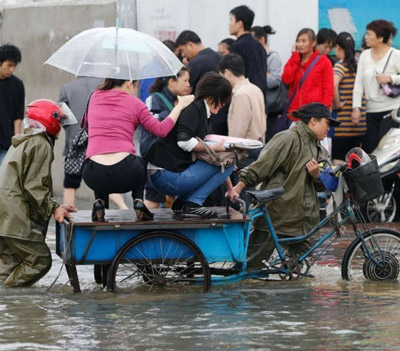 上海暴雨致地鐵口積水 人力車收費"過河"