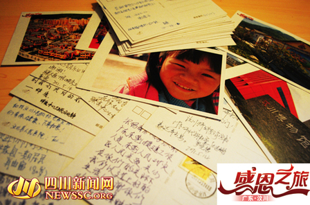 在四川新聞網特制的、展示汶川災后恢復重建成果的、印著“感恩之旅”和“廣東·汶川”的明信片上,一句句汶川群眾發自肺腑的感謝與惦念寫滿明信片的背面。