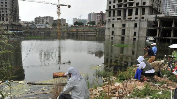 昆明一停工樓盤成“魚塘” 市民相約來釣魚