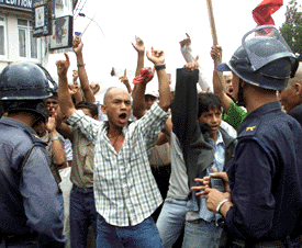 Many brandished sticks and threw stones at police in an upsurge of rage against the deaths of the country's popular monarch.