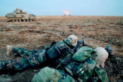 Tired after a two-day dash across the desert that put part of the 3rd Infantry Division within striking distance of Baghdad, American infantrymen were resting in a farm field Sunday when the radio crackled out orders to mount up. More than 30 Iraqi armored vehicles had been spotted heading toward the 2nd Brigade's positions outside the Muslim holy city of Najaf, and the soldiers hurried into their armored Bradley troop carriers and sped off to block the advance. Moving forward about six miles, the infantry company sheltered behind irrigation ditches, the six-foot dirt walls among the few features that rise above the table-flat land of the Euphrates River valley. Two companies of M-1A1 Abrams tanks fanned out on either side of the infantrymen. The soldiers first spotted the Iraqi column about six miles away, its armored vehicles just specks on the horizon and far out of range of the American guns. Off in another direction, the gold roof of Najaf's mosque glistened. Suddenly, coalition warplanes summoned to support the infantrymen of A Company, 3rd Battalion, 7th Infantry went into action. Aircraft flying too high to make out opened the fight by dropping a half dozen or so bombs. Air Force A-10s, the slow but potent attack planes often called "Warthogs," moved in next, peppering the Iraqi vehicles with missiles and cannon fire. One by one, the dots erupted in flashes, followed seconds later by the muffled sounds of explosions. No vehicle was seen to escape. About 45 minutes into the battle, B-52s flew over and rained bombs onto Iraqi infantrymen who were behind the armored vehicles. The battle was over. The infantrymen of A Company and their comrades in the battalion's two tank companies hadn't fired a shot. The soldiers made no attempt to check the damage inflicted on the Iraqi column. They held their ground at the levees and settled down to rest. As night fell they could see the lights twinkle on in Najaf. The brutal clash came after a headlong rush that took the 2nd Brigade's 70 tanks, 60 armored troop carriers and hundreds of support vehicles across 228 miles of desert in less than 40 hours. The move left them about 100 miles from Baghdad. The brigade's commander, Col. David Perkins, likened the thrust to another surprise military move - that of a Carthaginian general who caught the Romans off guard by getting his army over the Alps in 218 B.C. "I'm using the analogy of Hannibal taking elephants over the Alps," Perkins said. "But instead of the Alps, there are big wadis (gulches) out there and the elephants are the tanks." He said the goal was to send a message to Saddam Hussein's regime that the US military can move fast and resistance is futile. "There is a psychological component. If the president (Bush) can say, 'Look at your window, there is a tank brigade outside,' that can hasten the fall of the regime," Perkins said. The brigade roared across the desert in two sections: the armored combat vehicles leading as "Team Heavy Metal" and the wheeled support vehicles following as "Rock 'n' Roll." Advancing in a column that sometimes spread to six miles wide, speeding at 40 mph and trailing plumes of sand, tanks, troop carriers and trucks zigzagged across the desert, keeping away from towns, villages and highways to avoid detection. The only people encountered were Bedouin tribesmen, herding sheep, goats and camels. They came out of their tents and stared as the armored wave roared past. Inside each Bradley fighting vehicle, six infantrymen sat jammed together on narrow benches, their chemical protection gear soaked in sweat as they bounced across the desert for five hours at a stretch, stopping only to refuel. The cramped conditions and rough ride made sleep difficult. As the huge convoy advanced, Kiowa observation helicopters and long-range ground patrols spread out far in front to watch for Iraqi troops. When night fell Saturday, soldiers believed to be part of Iraq's ruling Baath party militia began chasing some of the patrols, causing the brigade to stop. One US combat unit began firing at the Iraqis, who were in dozens of trucks and other vehicles armed with machine guns, while another unit advanced to attack. "We've got a ... firefight, OK Corral out here," Lt. Col. Philip DeCamp told his company commanders. The Americans said they destroyed 15 vehicles, killed at least 100 Iraqi soldiers and captured 20. The halt left the 2nd Brigade near Najaf, a city on the western bank of the Euphrates that sits astride one of the main highways leading to Baghdad. Mosques in Najaf and Karbala are the most sacred sites to Shiite Muslims after those in Saudi Arabia. Imam Ali, the son-in-law and cousin of Islam's Prophet Muhammad, is buried in Najaf. Shiites aspire to bury their dead in its cemetery, which stretches for miles and is the largest in the Muslim world. (AP)