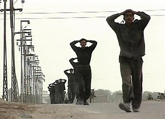 Unidentified Iraqi's surrender to British Royal Marines in southern Iraq Friday March 21, 2003 in this television image. US troops advanced through the deserts of southern Iraq in armored convoys Friday after launching the war's ground assault, meeting resistance from Iraqi forces in some areas and soldiers surrendering in others. [AP]