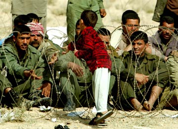 An Iraqi boy tosses a cigarette to Iraqi prisoners of war alongside a road leading to the southern Iraq city of Basra March 23, 2003. Fierce air strikes shook Baghdad on Monday but Iraqi fighters, buoyed by US and British setbacks, stalled forces trying to sweep north to the capital. Picture taken March 23. [Reuters]