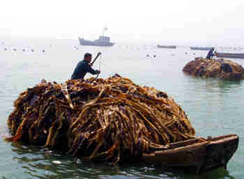 A fisherman carries harvested kelp alongside his wooden vessel back to the seashore in Dazhaojia Village in Yantai, East China's Shandong Province. The village is expected to reap more than 500,000 kilograms of kelp this year. [newsphoto.com.cn]