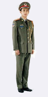 The People's Liberation Army (PLA) began to develop its new generation of service uniforms at the beginning of 1993. The new uniforms were presented to the Central Military Commission (CMC) for approval in 1995. The CMC held a meeting on April 10, 1995 to examine the new uniforms. By the approval of Chairman Jiang Zemin, who examined the new uniforms personally, the new generation of uniforms were first tried on by the PLA Garrison stationed in the Hong Kong Special Administrative Region on May 1, 1997 and were introduced to the three services in the spring of 2000. The new generation of uniforms includes nine items, namely, military dress uniform, spring/autumn military service uniform, summer military service uniform, sweaters, battle dress uniform, physical training dress , caps and decorations, shoes/boots, and bullet-proof vest. Military dress uniform 1. Style: Open-necked coat with picked lapel and square laps. Two lower insert pockets with flap. Toothed-edges (distinguishing type of service) at collar edge, sleeve cuffs and out-seams on trousers. Western-style trousers in dark greenish brown (Army), gray (Navy) or deep sky-blue (Air Force.) 2. Material: Thin whipcord 3. Decorations: Big cap insignia, hard epaulets, collar insignias, tie, tie bar, service mark tag, identity tag, aiguillette. 4. Cap: Peak hat. 5. Shoes: Leather.