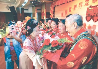 | | |  | | | Elderly couples in Fuzhou, Fujian Province exchange gifts on Qixi, which is regarded as Valentine's Day in China, August 4, 2003. The festival, falling on the seventh evening of the seventh month of the lunar calendar, can be traced back to an ancient legend about a devoted couple - a shepherd and a weaver - meeting across the Milky Way on the evening every year. [newsphoto.com.cn] | | | | | | | | | |
