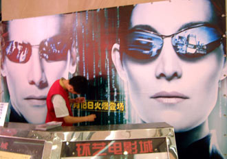| | |  | | | A worker puts up a poster of the star-studded "The Matrix Reloaded" outside a cinema in Shanghai, July 20,2003. The film is proved to be a great hit in China. Pictures International reported on July 22 that it has topped US$1.012 billion at the overseas box office this year. | | | | | | | | | |