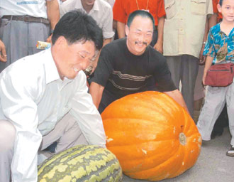 Two farmers yesterday smile after their winning bids at an auction - a 45-kilogram watermelon and a 90-kilogram pumpkin, at the ongoing Changchun International Agricultural Exhibition, Jilin Province. [cns]