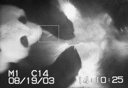 | | |  | | | Bai Yun, the San Diego Zoo's female giant panda, cradles her new born cub in the panda birthing den Tuesday, Aug.19, 2003, in this handout image from video released by the San Diego Zoo. The rectangle locating the offspring was contained in the image provided by source. Animal care staff know Bai Yun was pregnant with twins, however, as of Wednesday morning only one cub has been born. The first cub was born at 1:15 p.m. Tuesday. Bai Yun made world history in August 1999 when she gave birth to Hua Mei,the first giant panda cub to be born and survive in the United States. [AP] | | | | | | | | | |