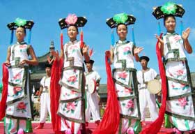 | | |  | | | Manchu girls wearing a traditional Manchu women's dress during a festival marking the 400th anniversary of the founding of Hetu Ala in Xinbin County of Fushun, northeast China's Liaoning Province, Aug. 23, 2003. Hetu Ala was founded in 1603 by minority leader Nurhachi, the first emperor of the Qing Dynasty (1644-1911), who declared himself Khan in 1616. [Xinhua] | | | | | | | | | |