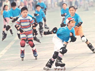 A group of children enjoy roller skating on Beijing streets yesterday. [CNS]
