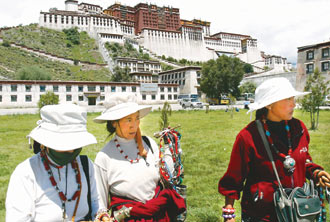 | | |  | | | A group of Tibetan women selling trinklets wait for visitors outside the walls of the Potala Palace, in Lhasa yesterday. The management decided to limit visitors to 1,200 a day and will slowly reduce the numbers of tourists and pilgrims to 850 a day, from the previously 3,000 a day due to the fragile structure of the huge and ornate palace, the symbol of Tibet Autonomous Region.[CNS] | | | | | | | | | |