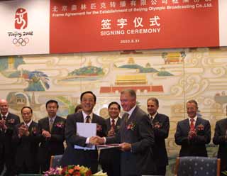 Liu Qi, president of the Beijing Organizing Committee for the Games of the XXIX Olympiad (third from left) and International Olympic Committee President Jacques Rogge (third from right) applaud the signing for the establishment of the Beijing Olympic Broadcasting Co Ltd August 31, 2003. The company will be the host broadcaster during the 2008 Games. [newsphoto.com.cn]