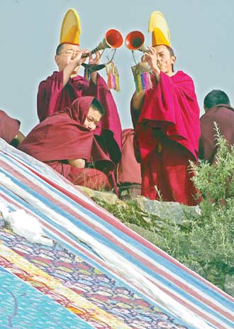 Buddhist Tangka on the hillside of the Drepung monastery, and blow trumpets to