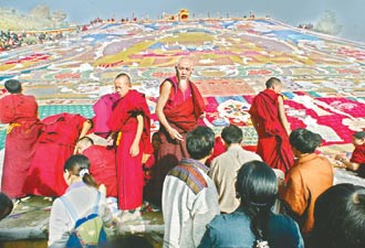 Lhasa on Wednesday. The week-long festival attracts thousands of pilgrims and