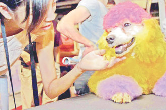 A young woman peddles a dog with its skins dyed in different colours yesterday in Shanghai during the Sixth Asian Pets Festival. About 10,000 thoroughbreds are on show. [CNS]