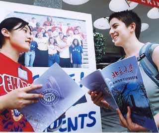 Dong Jianwei (left), a member of SICA (Students' International Communicative Association) of Peking University, gives information about the university to Allison Miller (right), a newcomer from the United States Monday September 1, 2003. About 468 foreign students from more than 60 countries checked in at Peking University for further study Monday when the new school year started. [newsphoto.com.cn]
