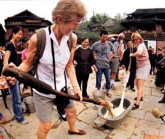 Two US tourists try making "Zanba" a staple food for some of China's ethnic groups, in a Dong minority village in South China's Guangxi Zhuang Autonomous Region last week. The week long National Day holiday has witnessed some 90 million tourists travelling across the country, a record high since the first "Golden Week'' holiday in 2000. [newsphoto.com.cn]