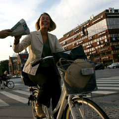 Christiania was originally an abandoned 41-hectare military camp. In 1971, it was taken over by squatters who proclaimed it a "free state" subject to their own laws. The police tried to clear the area but it was the height of the "hippie revolution" and an increasing number of alternative folk from throughout Denmark continued to pour in, attracted by the concept of communal living and the prospect of reclaiming military land for peaceful purposes. The momentum became too strong for the government to hold back. Bowing to public pressure, the community was allowed to continue as a "social experiment." About 1,000 people settled into Christiania, turning the old barracks into schools and housing, and starting their own collective businesses, workshops and recycling programmes. As well as hosting progressive happenings, Christiania also became a magnet for runaways and junkies. Although a policy was established later by local residents that outlawed hard drugs in Christiania, and heroin and cocaine pushers were expelled, marijuana and hashish is still openly sold (though not legally) and smoked here. "There is the Pusher Street in Christiania, and many pushers live there," said Hoslting. "That's one of the major reasons why Christiania remains controversial." We visited it the next morning. After half an hour walk, we saw an archway made up of two timber totem poles and a wooden board erected between two old buildings. It was the main entrance of Christiania. Passing through the archway, Klaus told us to look back to the wooden board, on which was written: "You are now entering the EU." Pusher Street and most of the shops in car-free Christiania are within a few minutes walk of the entrance. While we were close to the street, Klaus asked Jiang Dong to put his camera back in his bag. Soon I saw a yellow sign warning that photography is forbidden in the street. Pusher Street is actually a lane lined by booths. One or two pushers sit in each booth, in which marijuana joints and hashish from such countries as Afghanistan, India and Nepal are showcased. The pushers look no different than the common souvenir peddlers found in other parts of the city, except they are usually accompanied by large dogs. I saw several teenagers that looked like their customers. Passing a small market where pipes and jewellery are sold, Klaus guided us to the quieter living section of Christiania, where I met a resident. Monica Lee, 40, is a Danish-American who moved to Christiania from Norway when she was 10 year old. The married mother of a 15-year-old son has lived in Christiania ever since. She built a small house together with her husband. Though the house is rent-free, the family has to pay 5,000 krone (US$589.6) to the government for the supply of power, water and gas every month. She said she enjoys the liberal and laid-back atmosphere of Christiania even though she feels a little tired of it sometimes. After losing her job for eight months, she admitted that the family could not afford to rent an apartment outside. Still, she is worried about the future of Christiania, as the municipal government of Copenhagen is considering turning sections of it into new real estate development. "Being afraid of the government demolishing our houses, many of us haven't painted our houses for a year," she said. Pushers are the main source of troubles in Christiania, she admits, but she thinks the only way to solve the problem is "to legitimatize hashish like in Holland." "I'm worrying about my son smoking," she said. "But there is no way I can stop him. I smoked when I was 15 years old. It is something you have to experience on your way of growth." Mayor on bike After the visit to Christiania, Klaus offered to help us arrange exclusive interviews with such officials as the Prime Minister of Denmark, the Minister of Foreign Affairs, and the mayor of Copenhagen.