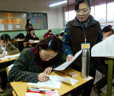 | | Part of Beijing's more than 15,300 hopefuls wanting to become judges, prosecutors or lawyers take the national judicial examination October 11, 2003 in one of the capital's 615 examination rooms. About 197,000 people throughout China, which is about 45 per cent less than last year, took the two-day standard examination needed to qualify for the positions. [newsphoto.com.cn] |