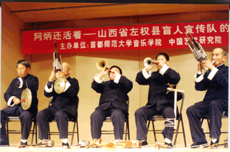 That was in a yard with a dilapidated outdoor stage in Zuoquan, a poor county in the Taihang Mountains area of North China's Shanxi Province. "I know why I cried," said Tian. "It was because of the truthfulness of the music." The musicians had no eye contact with the audience, and thus there was no artificial expression of any kind. "They don't notice whether you are listening or not," said Tian. "They seem to be singing to the sky, not only with their voices, but with their hearts, their souls and their life." Troupe's history The group of musicians that Tian saw were with the Zuoquan Blind Men's Publicity Team. The team was founded in 1938 in Zuoquan, where the Eighth Route Army fighting against the invading Japanese army set up and maintained a headquarters base for about five years into the early 1940s. The troupe's name is still marked with the character of the time and place. According to the "Annals of Culture in Zuoquan County," blind musicians of the Taihang Mountains area used to busk alone in an earlier period of time. When he arrived at the gate of a wealthy family, a blind musician would sit on a bench that he carried with him, and sing some benedictory words. If the family rewarded him with a meal, the busker would begin his formal performance. Later some blind musicians formed groups to busk together. A small group would consist of three or four people, and a bigger one of six or seven people. The percussionist would sit in the middle, with the huqin (two-stringed bowed instrument) on one side and the sanxian (three-stringed plucked instrument) and bamboo flute on the other. In 1938, the then Taihang Anti-Japanese Democratic Government, set up by the Chinese Communist Party, formed the Blind Men's Publicity Team. Continuing to tour in the countryside, they performed both traditional music and new works about the anti-Japanese war. After the founding of the People's Republic of China in 1949, Zuoquan Blind Men's Publicity Team developed into a 38-member troupe with five sub-groups. They were rewarded for their tour performances by the government, first with rice and later with money. Now the troupe has to survive on their own. Normally travelling in the villages of Zuoquan, they give regularly over 200 performances a year. "Most of the year, people can see them walking at the foothills of Taihang Mountains, quilts on their back, each member putting one hand on the shoulder of the person before him," said Tian. "Everywhere they go they bring the music of the earth." Tian decided to let people in Beijing hear this truthful music that is born in darkness. With the sponsorship of Chinese Academy of Arts and the Music School of Capital Normal University, he organized a tour for the troupe in Beijing. On October 8, 11 members of the troupe arrived in Beijing. Between October 10 and 15, they gave three concerts, one at the Capital Normal University, another at the Central Conservatory of Music and a final performance at Renmin University of China. Moving songs It was unfamiliar circumstances for most of them, as they are used to performing in yards or elementary school classrooms to groups of farmers. "We were a little nervous about performing here," said one of the musicians, Liu Hongquan, after one of the concerts. "But since we couldn't see, it was about the same for us." It was Liu who first moved Tian to tears in Zuoquan, when he sang "Guanggun Ku (A Single Man's Bitterness)," a folk song about the hardships of men who have no families. The song is made up of 12 repetitions of a simple and sad melody, which is a variation of the widespread Northern Shaanxi folk song "Xiu Jinbian (Embroidering the Golden Banner)." The 12 verses of the song employ the yuelingti form, a traditional form in Chinese folk songs that organizes the lyrics in the order of the 12 months of a year. "In January the plum blossoms flower / Everybody loves the plum blossoms / The single man wants to pick a flower / But there's no one to wear it at home. "In February the spring wind blows / The single man feels so sad and alone / His worn-out clothes are covered with holes / The single man has to ask others to sew and mend them / The single man doesn't want to ask others to sew and mend / But the spring wind is hurting his waist and legs. "In March comes the Pure Brightness Festival / All the families go to visit their ancestors' graves / Those who have wives go in groups / The single man goes by himself / Those who have wives are followed by their children / The single man can only watch in tears..." In a tone close to crying, Liu sang 12 sad stories of a single man covering 12 months of his life. Again, he moved some of the audience into tears with his untrained voice. Liu truly knows what the lyrics are about, for, like most of the members of the troupe, he has to live a single life himself. Now 34, Liu was born blind. He liked music when he was a child, and learned to play the erhu (two-stringed bowed instrument) and suona (type of horn) by himself. Liu's father did not want him to become a folk musician, living a wayward life performing on the road. Therefore, after graduation in 1992 from the Blind People's School in Taiyuan, capital of Shanxi Province, Liu became a masseur. However, his love for music never stopped. After his father passed away in 1995, he quit his massage job and joined the Zuoquan Blind Men's Publicity Team. "I will continue to play music," said Liu. "Nothing will change my love for music." Special musicians Six of the 11 musicians were born blind, while the others lost their sight because of accidents or illness. Head of the troupe, 50-year-old Wang Yuzhong was the victim of an explosion 30 years ago. He lost not only one eye, but also his left hand and the first part of his right middle finger. With glasses, he has partial sight with his left eye. "The accident brought me terrible pain, both physically and mentally" said Wang. "I lost my way in life." Wang had never studied any in