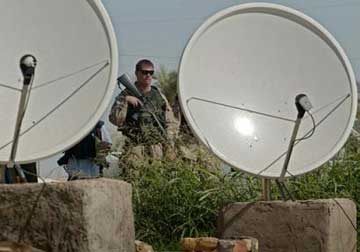| | A U.S. Army 4th Infantry Division soldier stands behind two satelite dishes near a TV and radio retransmitting tower in Tikrit, 193 km (120 miles) north of Baghdad, Iraq, Tuesday, Oct. 21, 2003. The transmitter will carry the radio and television signal from the U.S.-backed media network in the Iraqi capital across the northern Salah Ad Din province of 1 million people. [AP] |