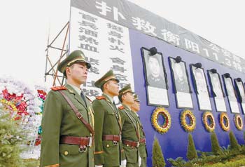 Woe and tears clouded the service as Xue Jiyong, father of the martyr Xue Xianglin, recalled his son. "I feel proud of my dear son," Xue said. "May you rest in peace, my dear fellow soldiers," said Yang Youliang, an officer in the Hengyang city firefighters unit. Zhou Yongkang, minister of public security, praised the firefighters' deeds and "dauntless heroism" in his speech. "These firefighters have set up dedicated examples for our university students," said Wang Kaibin of the Hengyang-based Nanhua University. Numerous citizens in the country posted messages of sympathy on the Internet, honouring the men. The Ministry of Public Security said it was the worst firefighting accident since the founding of the People's Republic of China in 1949. The firefighters had rushed into the eight-storey building just two minutes after a fire alarm was raised in Xuanting Village of Zhuhui District of Hengyang City at 5:43 am On November 3. The eight-floor building suddenly gave way, leaving two dead on site and 19