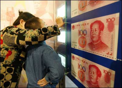 | | |  | | | A woman and her son get a close up view of a Chinese 100-yuan note at an exhibition in Beijing. China's currency peg is a hot-button issue for President George W. Bush as he heads to an Asia-Pacific summit pressing for freer exchange rates in a bid to ease the crushing US trade deficit and revive the sagging US labor market. [AFP/file] | | | | | | | | | |