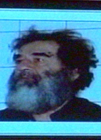 A photo of Saddam Hussein after his capture is shown during a press conference in Baghdad, December 14, 2003. U.S. administrator Paul Bremer said on Sunday Saddam Hussein was captured on Saturday near his hometown of Tikrit. [Reuters]