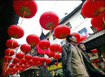 rows of Chinese traditional red lanterns at Shanghai's Yu Garden. Flower